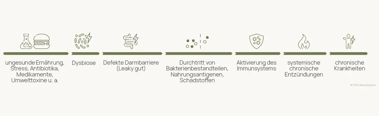 Bei einem Leaky Gut können Bakterienantigene wie Lipopolysaccharide (LPS), Nahrungsbestandteile oder Umweltgifte ungehindert die Darmwand passieren. Dies aktiviert das Immunsystem und führt zu chronischen, systemischen Entzündungsreaktionen. Diese verlaufen oft lange symptomlos, bevor sie sich in Form chronischer Erkrankungen manifestieren.